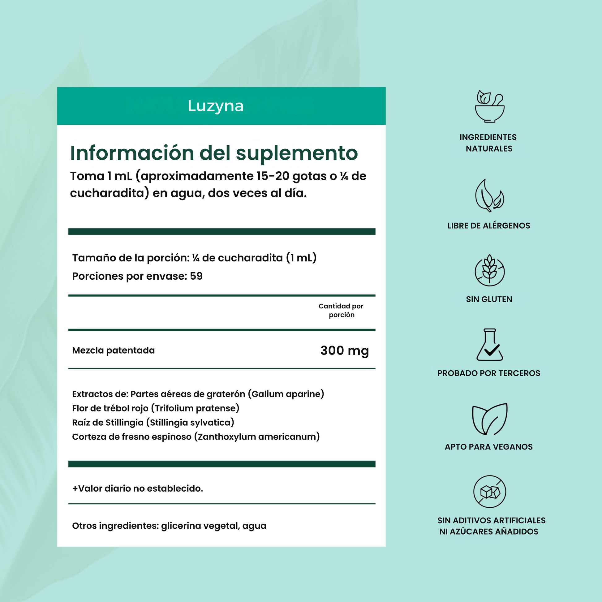 Las Gotas de Drenaje Linfático Luzyna están elaboradas con ingredientes suaves de origen vegetal para favorecer el flujo linfático, reducir la hinchazón y promover la desintoxicación diaria: